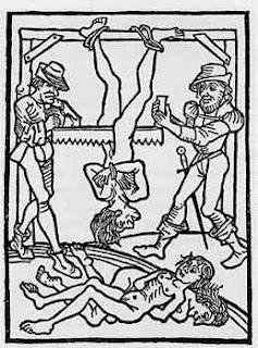 This one seems pretty clear, but the question is, why would anyone, especially a man, want to rip the breasts of a woman? The answer: to deform and punish her for adultery, blasphemy, heresy, self-induced abortion, and a number of other crimes that the inquisitor could choose to charge her with.
